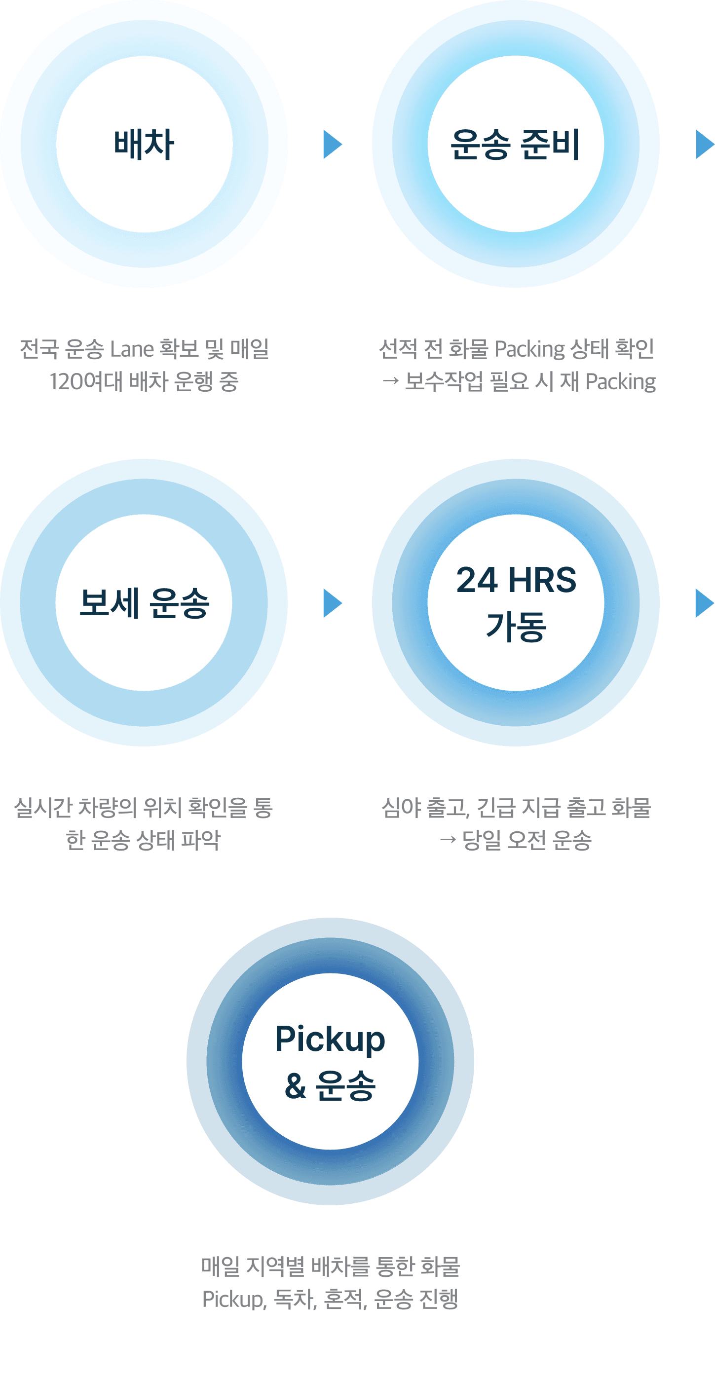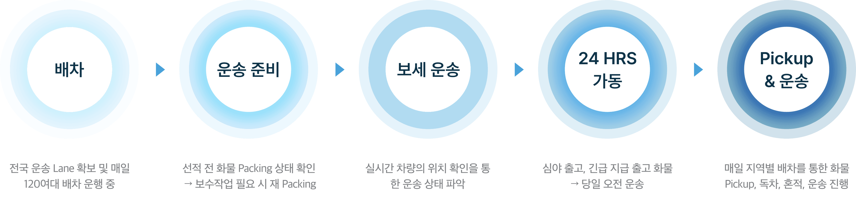 국내 물류 네트워크를 바탕으로 최적의 운송차량 확보와 물류비용을 최소화할 수 있는 경로를 통해 신속, 안전한 One-Stop Service를 제공하고 있습니다.