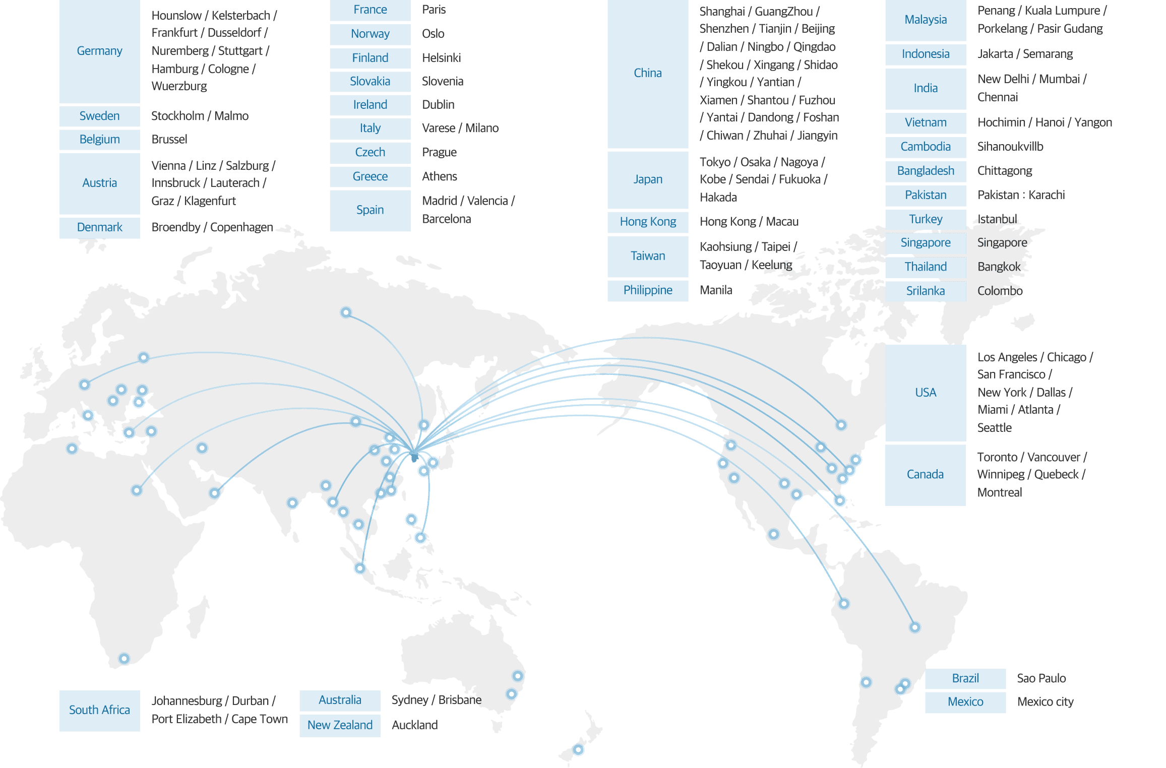 미국(LAX, SFO, NYC, CHI, ATL), 베트남(하노이), 태국(방콕), 중국(청도, 연태, 상해, 심천, 홍콩)